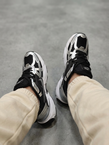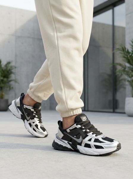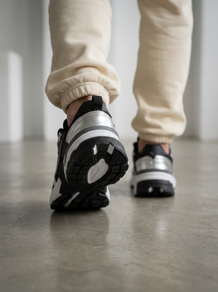 ترکیب رنگ مشکی عمیق با جزئیات نقرهای متالیک (Metallic Silver)، ظاهری لوکس، قدرتمند و کمی فضایی به این کفش بخشیده است. لایههای پلاستیکی کناری که یادآور مدلهای کلاسیک “وومرو” هستند، در کنار طراحی چندلایه و چانکی، این محصول را به گزینهای بینظیر برای ست کردن با شلوارهای جاگر، کارگو و جینهای بگ تبدیل کرده است. این رنگبندی خاص، تعادلی عالی میان سنگینی و درخشش ایجاد میکند.